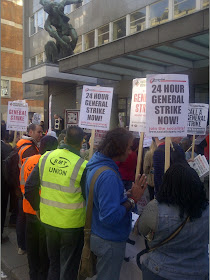 Up to 200 trade unionists, workers and campaigners lobbied the TUC general council from 8am this morning, 24th April. No one in the vicinity of the Great Russell Street TUC headquarters in London would have been left with any doubt about what was demanded: "Name the date - for a general strike!"Rob Williams, chair of the National Shop Stewards Network (NSSN) that had called the lobby, compered a rally, inviting speakers to address the crowd. He explained that the NSSN has been campaigning tirelessly for the TUC to name the date for a 24-hour general strike. He reminded us of the 1,000-strong lobby of the TUC congress in Brighton last September. That day the TUC voted for the POA prison officers' union motion to consider a general strike.Today, with even more reasons to organise coordinated action, from pay freezes to the bedroom tax, the general council was debating it.