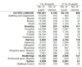 In the boroughs of Harrow, Redbridge and Sutton, over a quarter of KS2 pupils are taught in classes over 30. In Bromley that's as high as 40%, with nearly 5000 pupils taught in these oversize classes.